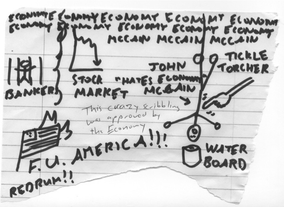 Late update: The McCain campaign has just released evidence that they claim proves that the economy is against John McCain. The scrap of paper appears to show the angry scrawl of a clearly disturbed and bitter economy. The authenticity of the document has not been established.