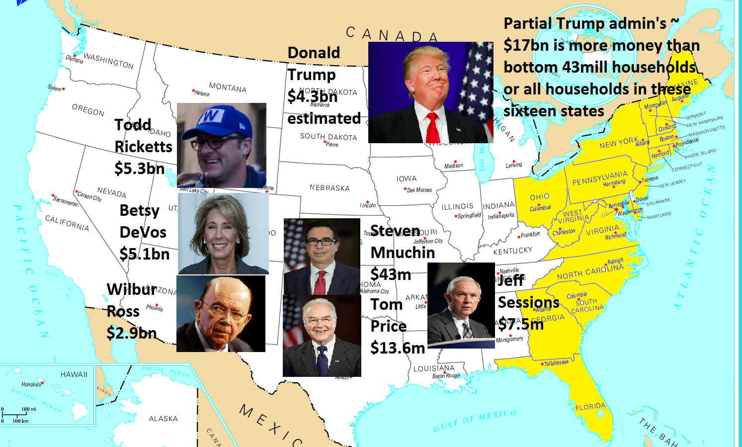 A partial list of Trump's cabinet picks has a net worth of $17 billion (including Trump). That is as much wealth as the bottom 43 million households (43,000,000). I know how hard it can be to grasp such vast numbers so hopefully the graphic below will help. The seven people displayed have wealth equal to all of the households on the Eastern seaboard plus West Virginia and Ohio. Household data was from the Census Bureau. The wealth stats are from The Guardian.