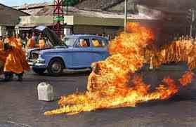Seconded. A very poetic essay. The image is, (I think), the self immolation of Buddhist monk Quang Duc who acted so in protest of the South Vietnamese Diem regime's persecution of Buddhists.