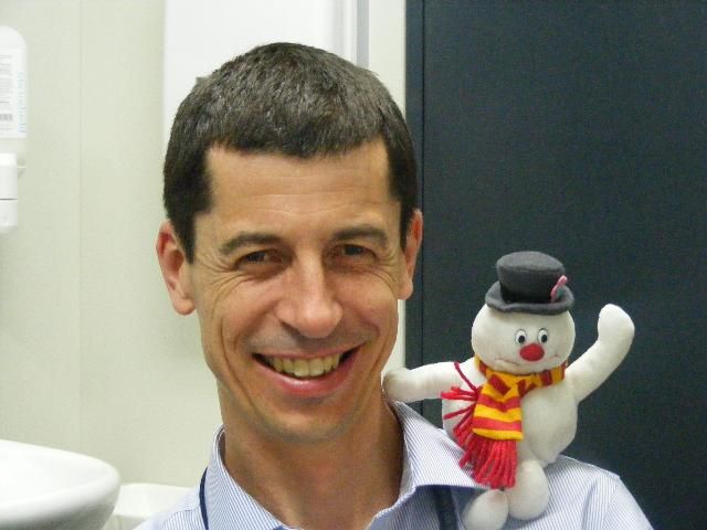(Posing with Spondyville's globe-trotting mascot, Stiffy the Snowspondy; On the left, the head of the Spondylitis society of Slovenia, and on the right, Dr. Matthew Brown, a well-known Spondylitis researcher in Australia.)