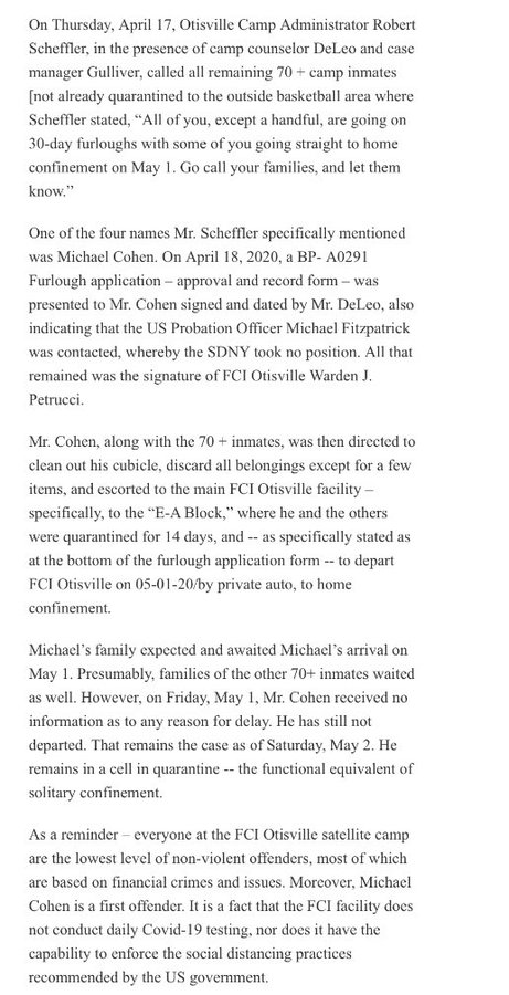 Cohen received no sympathy from his sentencing judge, who described his bid for compassionate release a media stunt. The BOP then indicated it would release him, before the recent delay. https://t.co/1FVK9LSsQV