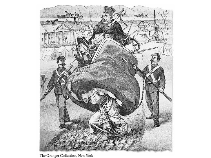 A nice picture but it does not depict the reason that Union troops came into the South. Following the assassination of Abraham Lincoln, Andrew Johnson tried conciliation with the South. The South responded by electing government's geared to preventing Blacks from voting and enacting the Black Codes. The Black Codes placed limitiatons on education, employment, and travel. Blacks were terrorized by Whites prior to arrival of the troops.