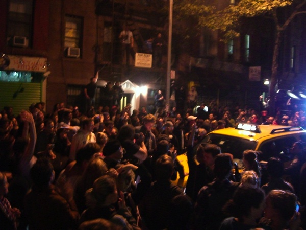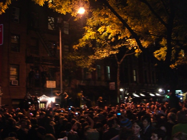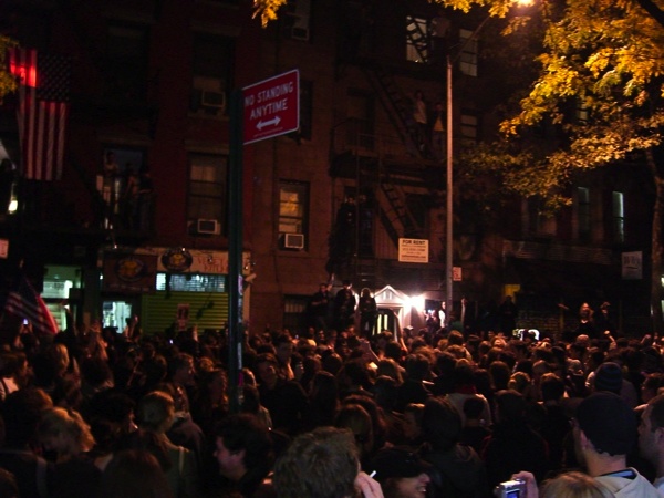 Walked home last tonight after a joyful election party in the West Village, NYC--good crowd, wonderful friends, incredible victory. Felt a bit melancholy, in the way you do after achieving something for which you have striven for so long. It's my birthday. November 5th. Marvelous birthday gift from the American voters. 37. Strange age to be. People shout gleefully on sidewalks. Cars honk happily on streets. High fives with strangers. Arrive at St. Marks Place in the East Village. Crowd on the corner. Cheering. Stand on a pay phone, take photos. Walk down St. Marks, winding through the crowd. Hapless cops make bullhorn shouts. Useless. People crowd the street, shouting and cheering. Mostly young. Some old. Cabs are trapped, honking, some with joy, some with frustration. Cops try to make way for traffic. Useless. Speak to a man who was arrested then freed, after shouts from the crowd. Cops yield, block off the street for celebration. Someone blasts music. From an apartment? Queen. We Are the Champions. People dance in the street. People dance on the fire escapes. American flags wave. Young men clamber onto cars, wave hands and flags. Crowd chanting: O-ba-ma! O-ba-ma! Crowd singing: O say can you see... Speak to strangers. Dance. Cheer. Take more photos. Watch crowd. Feel alive.