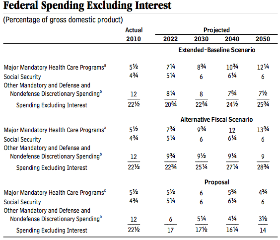 According to Congressional Budget Office projections, the budget plan would save an amount equivalent to 12 percent of the GDP in 2050. A full two-thirds of those savings would come from Medicare and Medicaid savings.