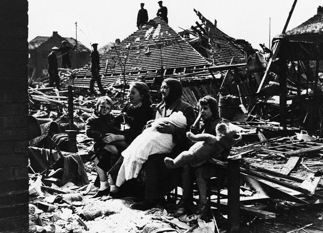 Woman and children sit amongst the rubble of a destroyed home during the Battle of Britain. |
