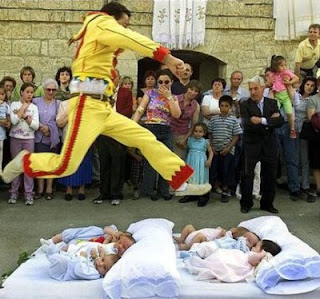 Want your baby to protect your baby from illness? Sign him/her up for the Baby Jumping Festival of Castrillo de Murcia, which takes place every year in northern Spain. Since 1620 the town puts rows of babies on a small mattress and then has grown men dress up like the devil (or el Diablo) and jump over the helpless babies. As of yet, no babies have been harmed. Until some one trips and falls on the babies, then I assume town mothers will think twice about having an idiot in a costume jump over their baby.