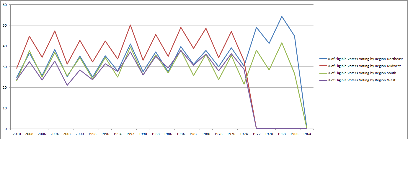 This is a very interesting graph. The Northeast steeply dropped in eligible voters exercising their right to vote, which is kind of interesting to me, and it makes me wonder exactly what happened, did people just give up and decided it isn’t a worthwhile activity any longer? No conclusions can be drawn from this data, all this data does is mark the downward trend in voting, what we do see it eligible voters in the Midwest are consistently voting in higher numbers than other regions.