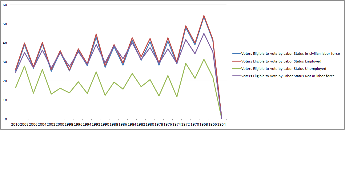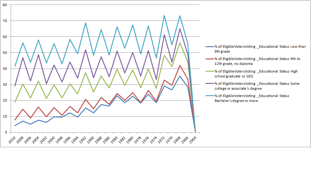 This graph doesn’t tell us anything we didn’t already know, there is a very steep drop in those people voting who have no high school diploma. In earlier years that group voted with a much greater frequency, lower than the rest but certainly better than the under 10% today, in comparison to the 40% in 1968.