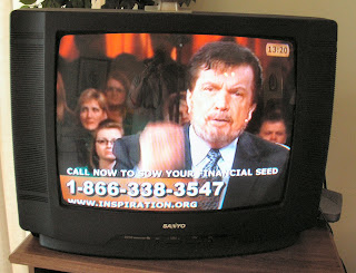 "Quickly, quickly", they say, "Don't even think about it. Get out your checkbooks, max out your credit cards if you have to (Yes, MAX them out!), send in your next mortgage payment--have faith that it will all return to you 10-fold, 100-fold, a THOUSAND-fold. Do it now! (Cue the tearing up, the catch in the voice. Say the word "MIRACLES" loudly, sharpen the S and hold it.)