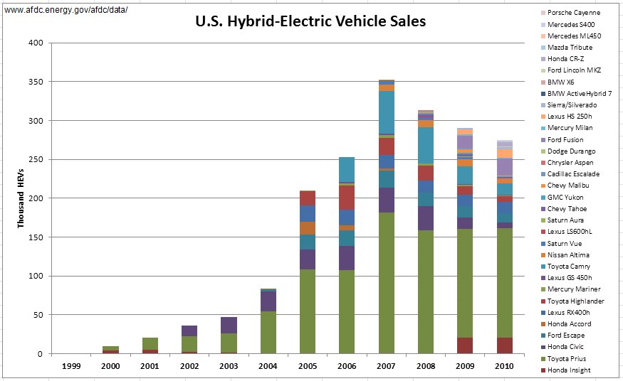 Hybrid sales began dropping in 2008, too, but their market share continued to increase slightly. Based on the HEV chart, even as the overall market declined, even as other hybrid vehicle sales declined, Prius sales held up well. The Prius is, and has usually been, about half of all hybrids sold. Prius dropped to only 42% when the Camry hybrid came into the market in 2006, but has remained at 51% every year since then except 48% in 2009. Delays due to the earthquake/tsunami/nuclear disaster may well change that in 2011 reports, of course.