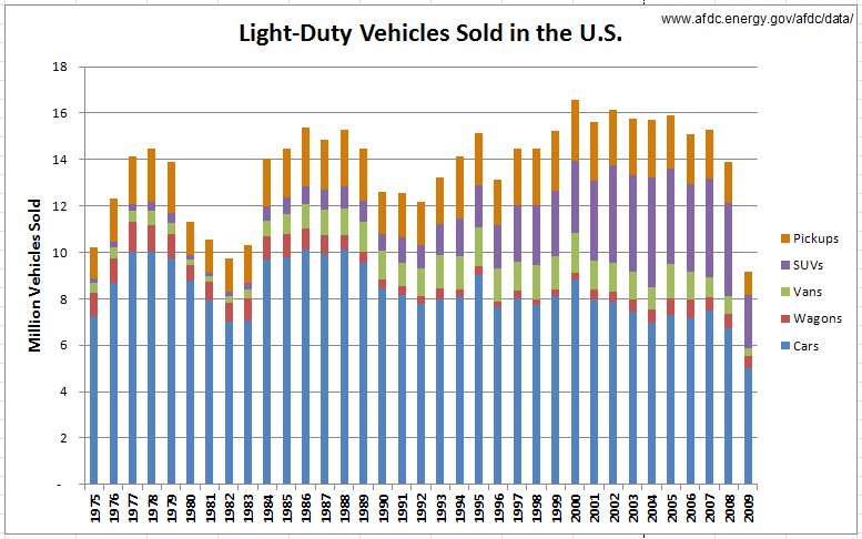 As shown on the DOE Alternative Fuels & Advanced Vehicles Data Center chart above, overall car sales were in the doldrums since 2001, but really tanked with the recession. While overall sales from 2008 to 2009 dropped by 34%, Vans dropped 53%, Pickups dropped 45%, SUVs dropped 42%, Cars only dropped 26% and Wagons only dropped 13%. There seemed to be a move towards less expensive vehicles. How did hybrids fare?