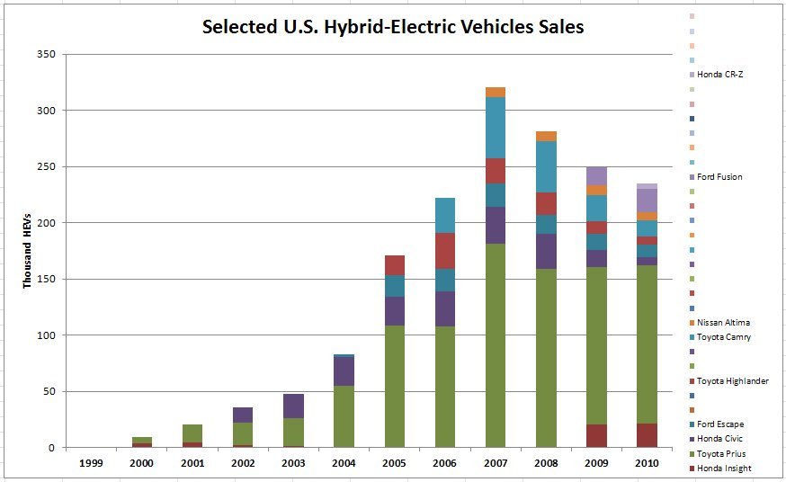 To simplify the chart, I took out luxury cars and any model that sold less than 5,000 in 2010. Sales of Toyota's Highlander and Camry hybrids have declined. I'd guess that the Ford Fusion Hybrid is competing well with the Cambrid. Ford hates the persistent rumors that it is licensing its drivetrain tech from Toyota, but they are very similar. Nissan does license their hybrid tech from Toyota, but hasn't done as well as the FFH. Ford Escape Hybrid has declined slightly. The mild hybrid Honda Insight is providing minor competition (probably because it looks something like a Prius), but the mild Civic and Accord hybrids seem to be fading.