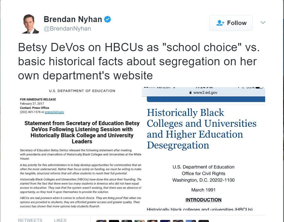 Betsy DeVos knows her history. I obviously do not, because I thought the Historically Black Colleges and University's were created because Black American's were barred from attending schools with white people. But I was wrong, I was so wrong!! Who knew. Today I learned that Jim Crow is just another phrase that means school choice! Woo! All the problems that ever existed, never really existed. I love Trumpworld. It's the best ever.